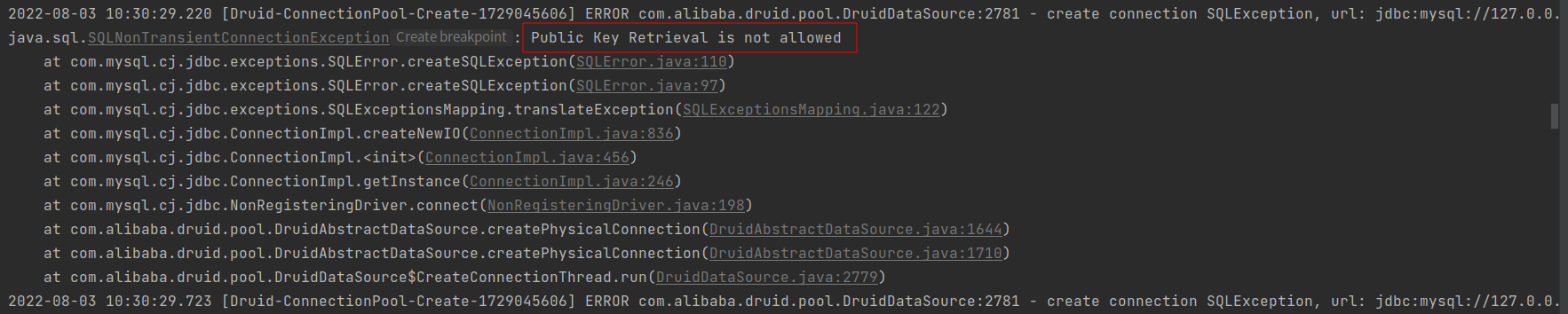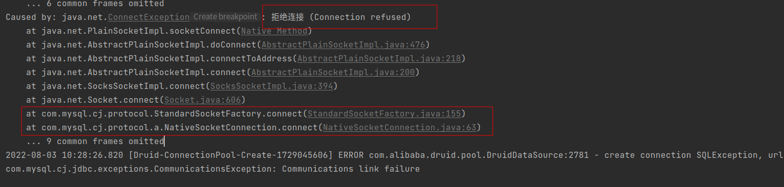 错误原因: mysql配置错误,可能原因: mysql未启动/ip错误/端口错误/网络不通